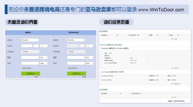 访问www.WinToDoor.com,无论你是普通跨境电商还是专门的亚马逊卖家,都可以选择合适自己的询价方式并完成对多个目的地的同时询价。只要填入多个目的地地址信息和货物重量体积,即可瞬间得出物流全程费用和预估的送达时间。