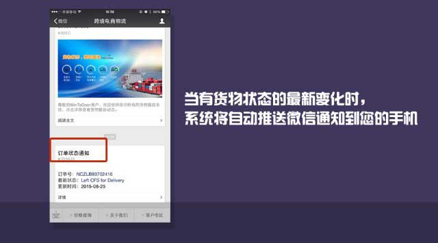4、当有货物状态的最新变化时, 系统将自动推送微信通知到您的手机。