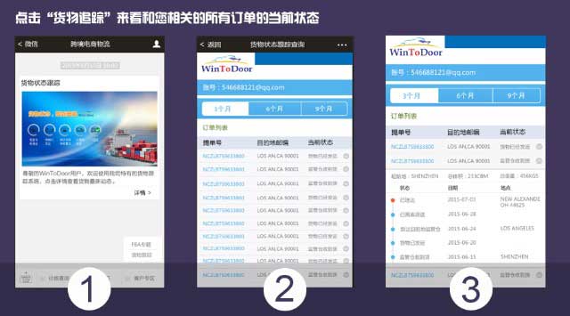 为了带给用户更贴心的服务和便利,我们的“跨境电商物流 WinToDoor”微信服务号,最新开通了“货物跟踪”微信功能,让您摆脱电脑端的束缚,随时随地, 即可查阅您最新的货物信息。