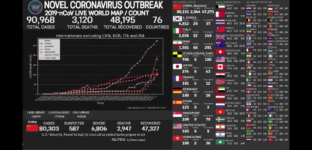 如图最新数据显示,截止北京时间3月3日12时,除中国外,72个国家累计确诊10614例,死亡164例!